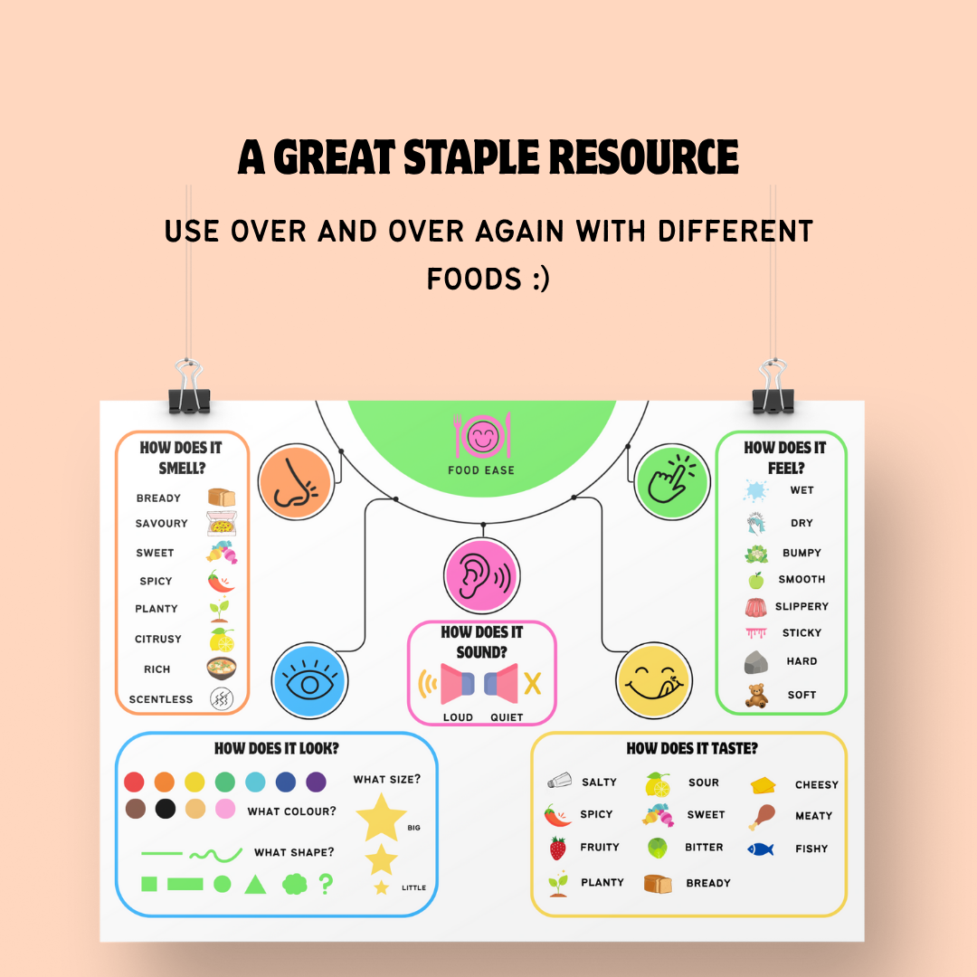 - Builds familiarity for all kids with new foods but especially for those with strong sensory preferences, by knowing exactly how a food will sound, feel, smell and taste they are more prepared to try in future